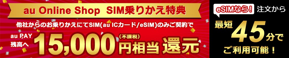 au Online Shopで他社から乗りかえ&SIMのみ契約(au ICカード/eSIM)で、au PAY 残高へ15,000円相当(不課税)を還元